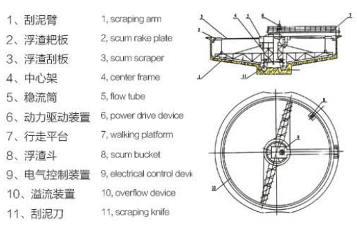 特點:該機采用中心傳動垂架式,下部采用整體對數螺線刮 板,上部設有浮渣收集裝置,池壁四周設溢流裝置及浮渣 排出裝置。該機傳動機構為行星擺線針輪減速機與帶外齒 的大型回轉支承二級減速具有傳遞扭矩大,運轉平穩(wěn),穩(wěn) 流效果好等優(yōu)點。